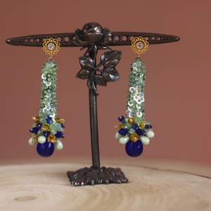 Blue drop earrings, mint green sequins, long stud festive earrings