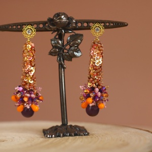 Red drops berry long earrings, sequin embroidery, gold green grey beads