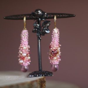 Long earrings with tiny flowers, pink shades sequins stud